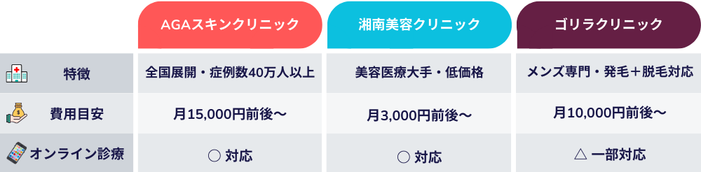 この記事では、AGAスキンクリニック・湘南美容クリニック・ゴリラクリニックの3つを比較し、それぞれの特徴や料金をわかりやすく解説します。
